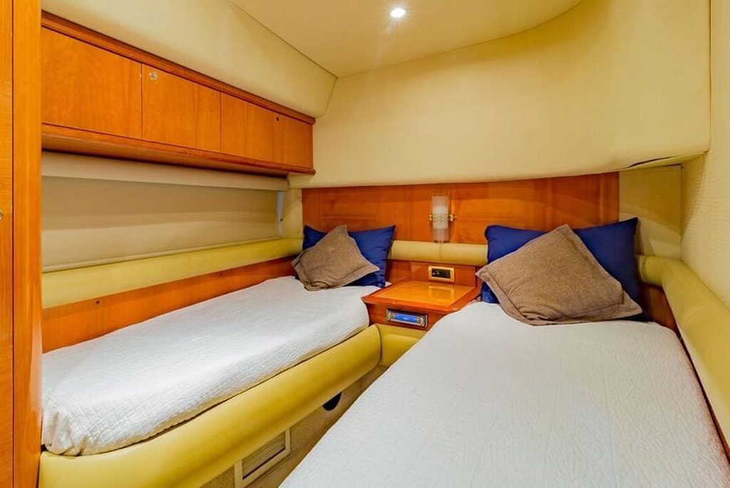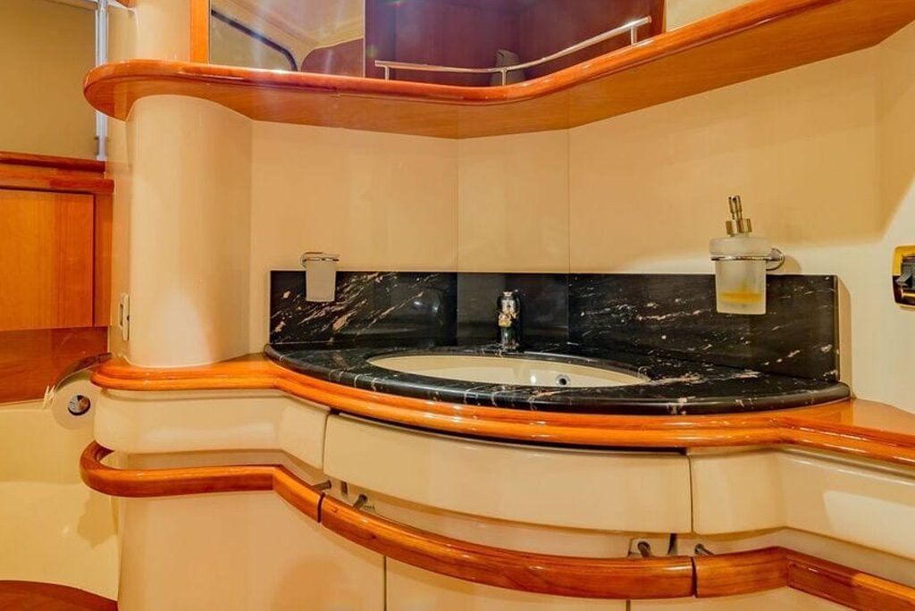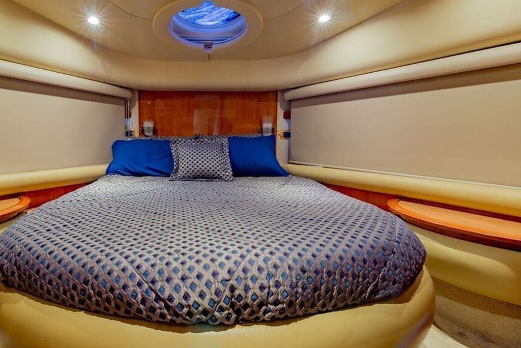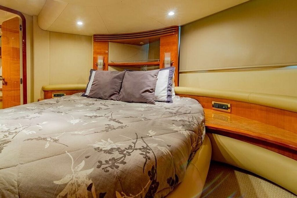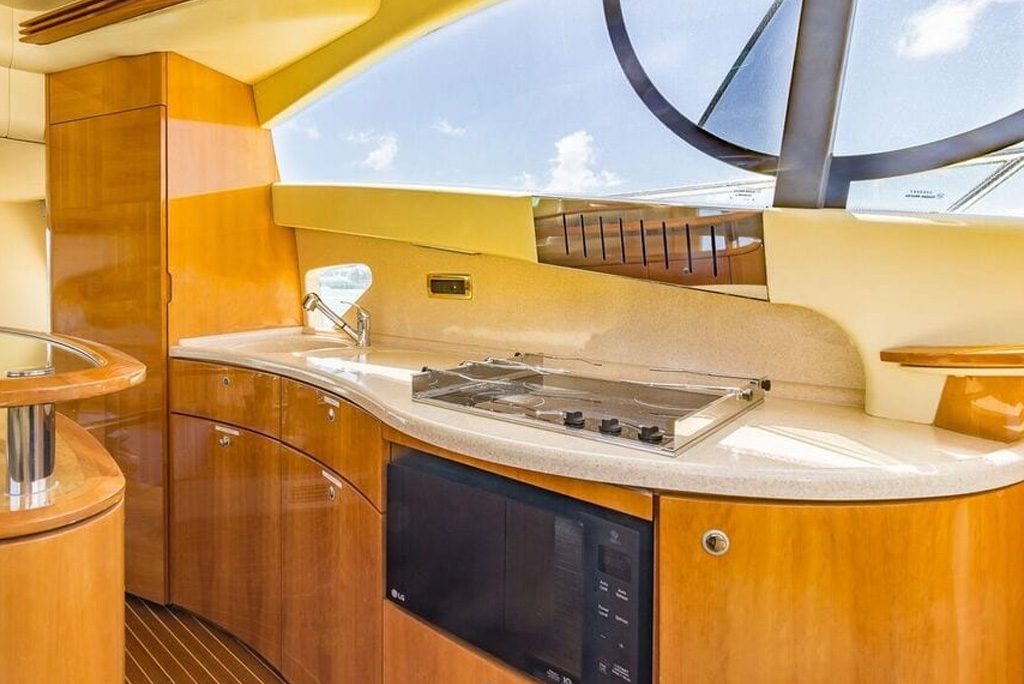 Inside, you’ll find a luxurious interior with plenty of room to entertain your guests. The yacht features three spacious staterooms, each with their own private bathroom, as well as a comfortable salon and fully-equipped galley. There’s also a spacious flybridge with plenty of seating, making it the perfect spot to enjoy a cocktail while taking in the breathtaking views.